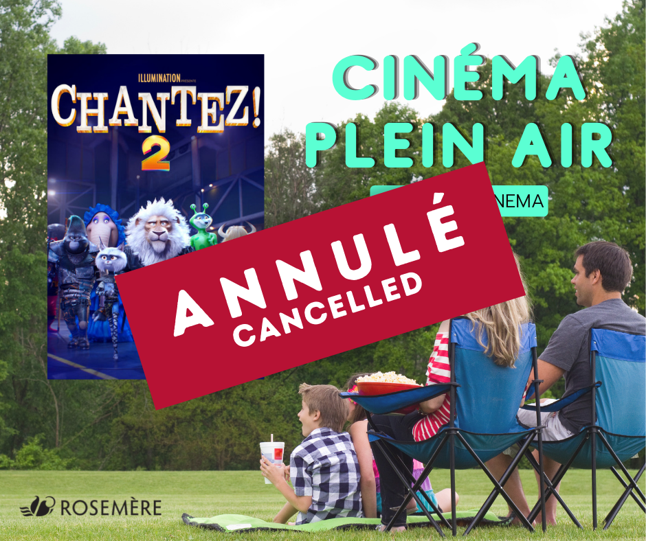 En raison de la température instable et des vents, la projection du film Chantez 2 prévue sur le parterre des loisirs est malheureusement annulée.