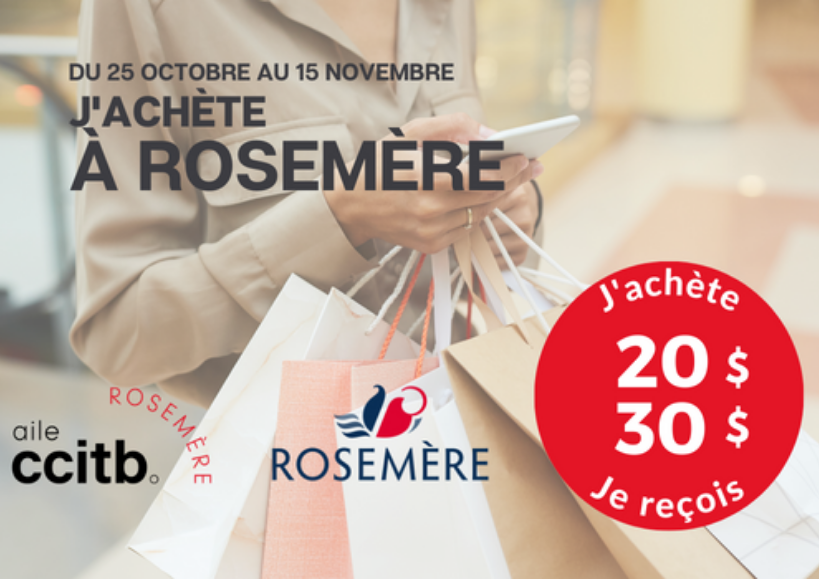 L’Aile Rosemère tiendra sa 4eédition de la campagne d’achat local J’achète à Rosemère. Du 25 octobre au 15 novembre 2023, la population pourra se procurer des bons d’achat au coût de 20$ chez les commerçants participants de Rosemère. Ces bons seront bonifiés de 10$ grâce au soutien de la Ville de Rosemère.