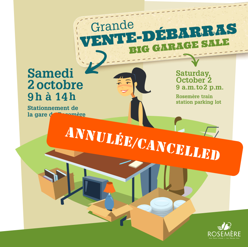 The garage sale that was supposed to be held on Saturday, October 2, from 9 a.m. to 2 p.m. in the parking lot of the Rosemère train station has been cancelled due to a lack of participation. However, those who already registered will have a spot in the library parking lot on Saturday, October 9, from 9 a.m. to 2 p.m.