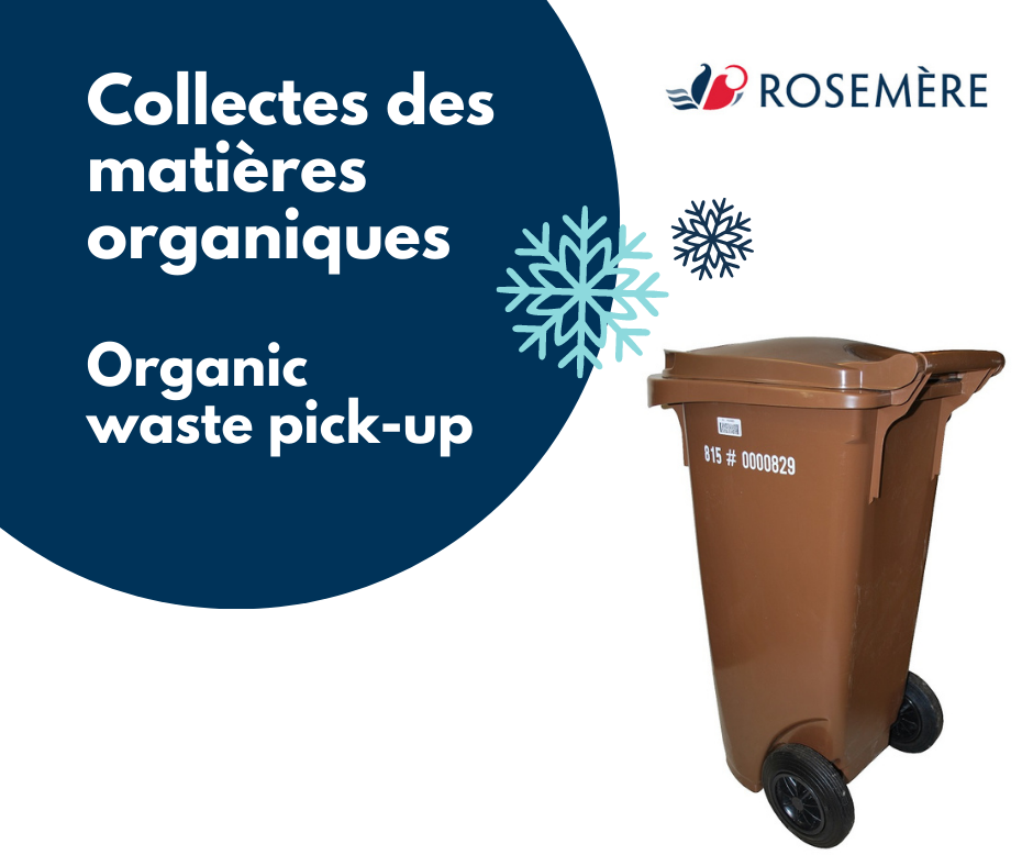 Pour plus d’information sur les dates de collectes des matières organiques, consultez le calendrier municipal ou notre site web à l’adresse : https://www.ville.rosemere.qc.ca/nouvel-horaire-collectes-des-matieres-residuelles/.