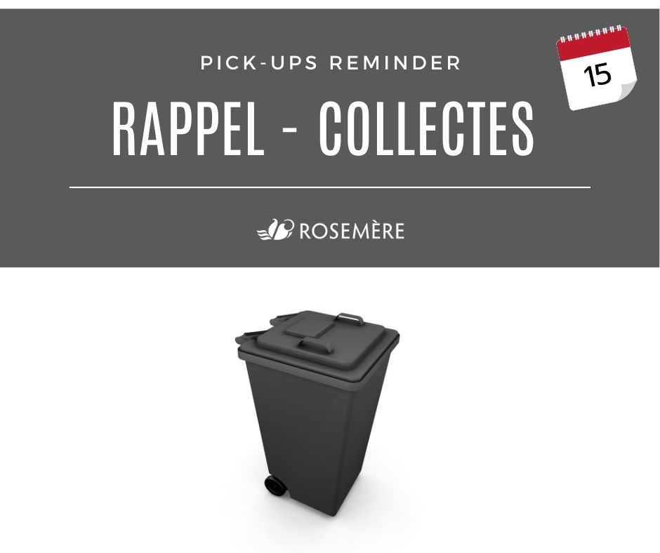En guise de rappel, dès le 5 avril, l’horaire de la collecte des déchets retourne aux deux semaines et la collecte des matières organiques à chaque semaine du mardi au vendredi, selon votre secteur. Vous trouverez tous les détails sur notre site Web au https://www.ville.rosemere.qc.ca/nouvel-horaire-collectes-des-matieres-residuelles/ et dans votre calendrier municipal distribué en décembre dernier.