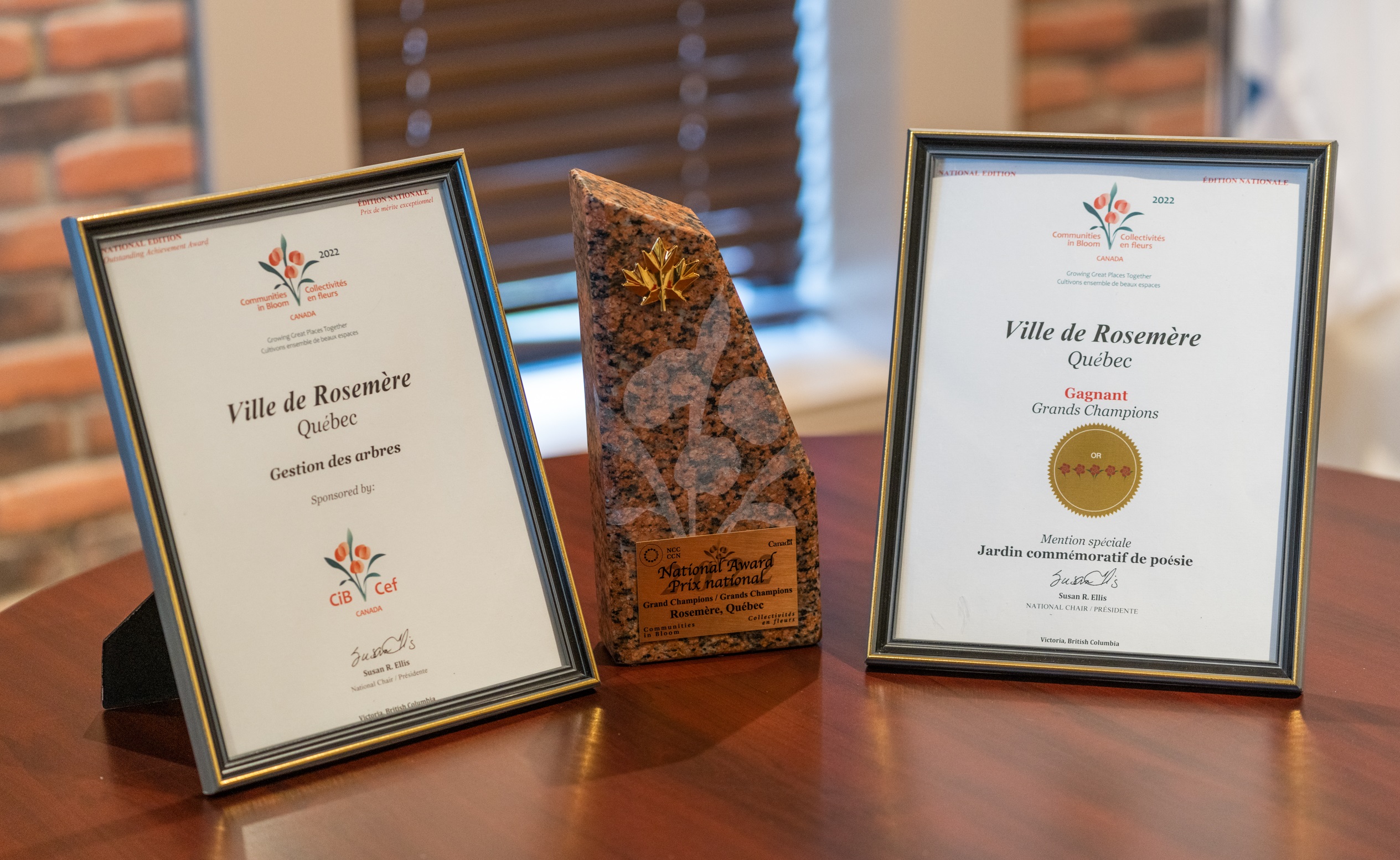Lors des cérémonies de remise des prix du concours Collectivités en fleurs, tenues les 21 et 22 octobre dernier à Victoria, en Colombie-Britannique, la Ville de Rosemère a reçu le titre Grands Champions pour les Gagnants nationaux et internationaux en recevant 5 fleurs – Or, en plus d’une mention spéciale pour le Jardin poétique et commémoratif de la maison Hamilton. Elle a aussi reçu le prix Collectivité en fleurs, Gestion des arbres pour les Prix de mérite exceptionnel.
