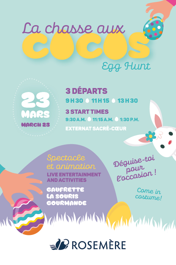 On March 23, hop on over to Externat Sacré-Cœur to go hunting for Easter eggs. Registrations will be taken for one of three start times: