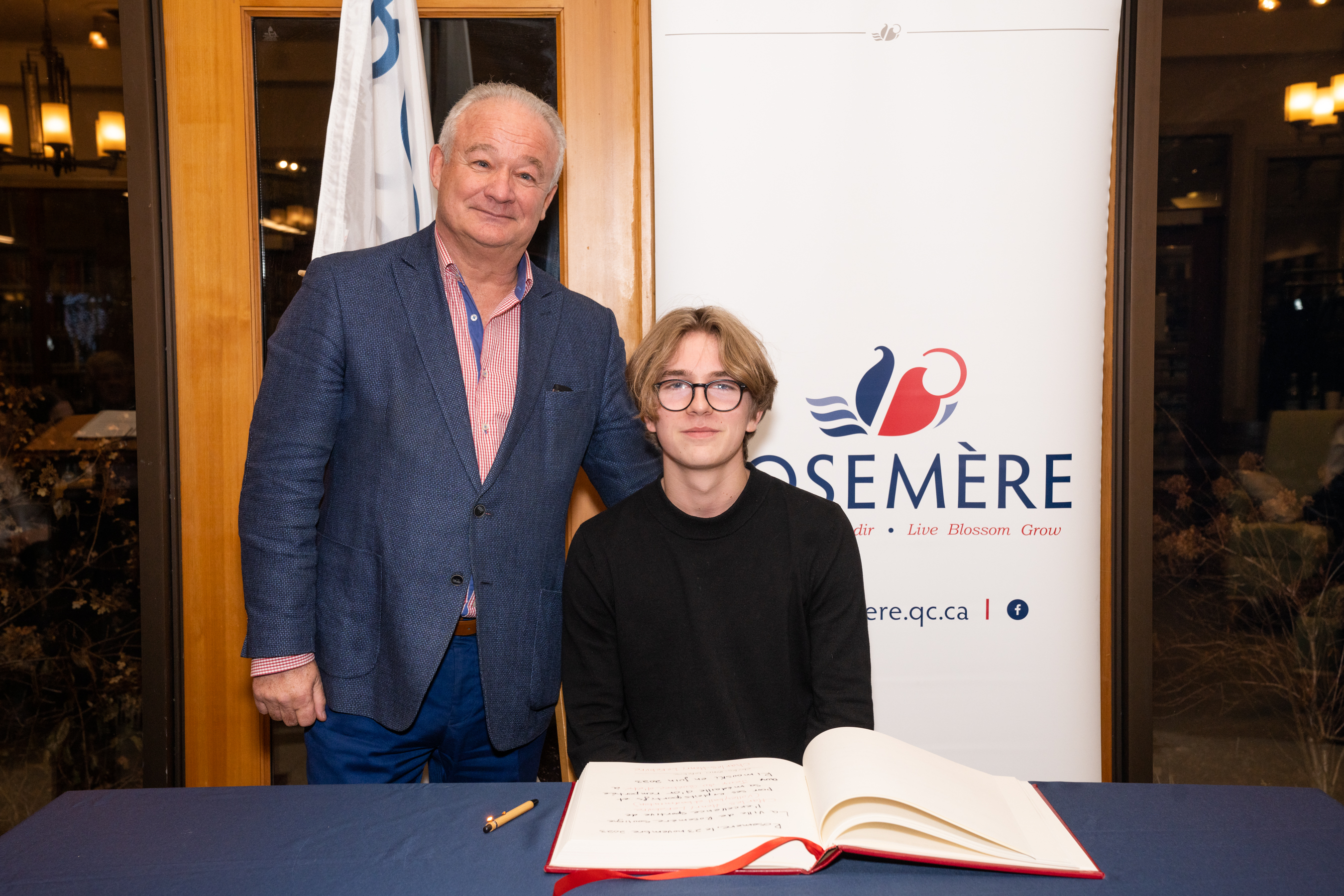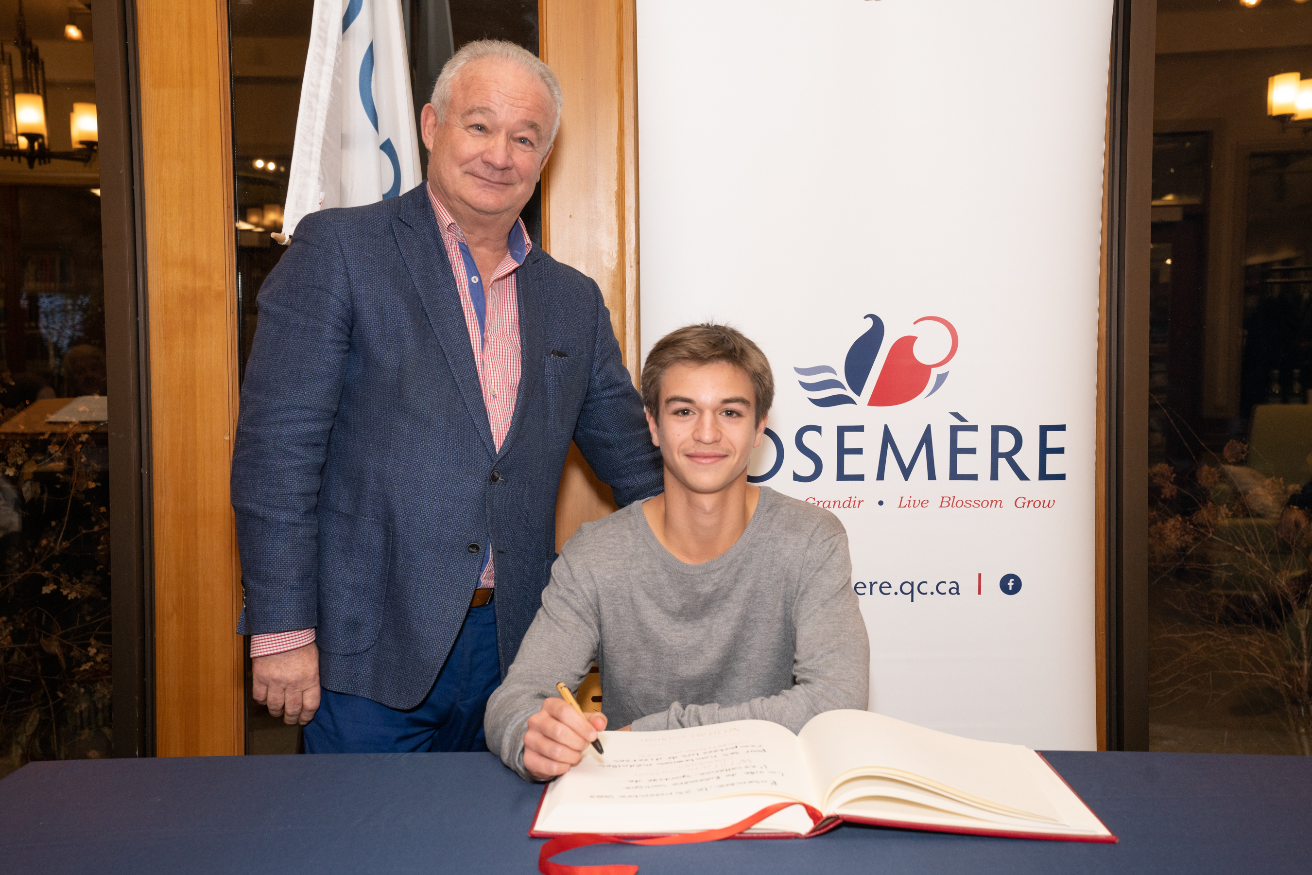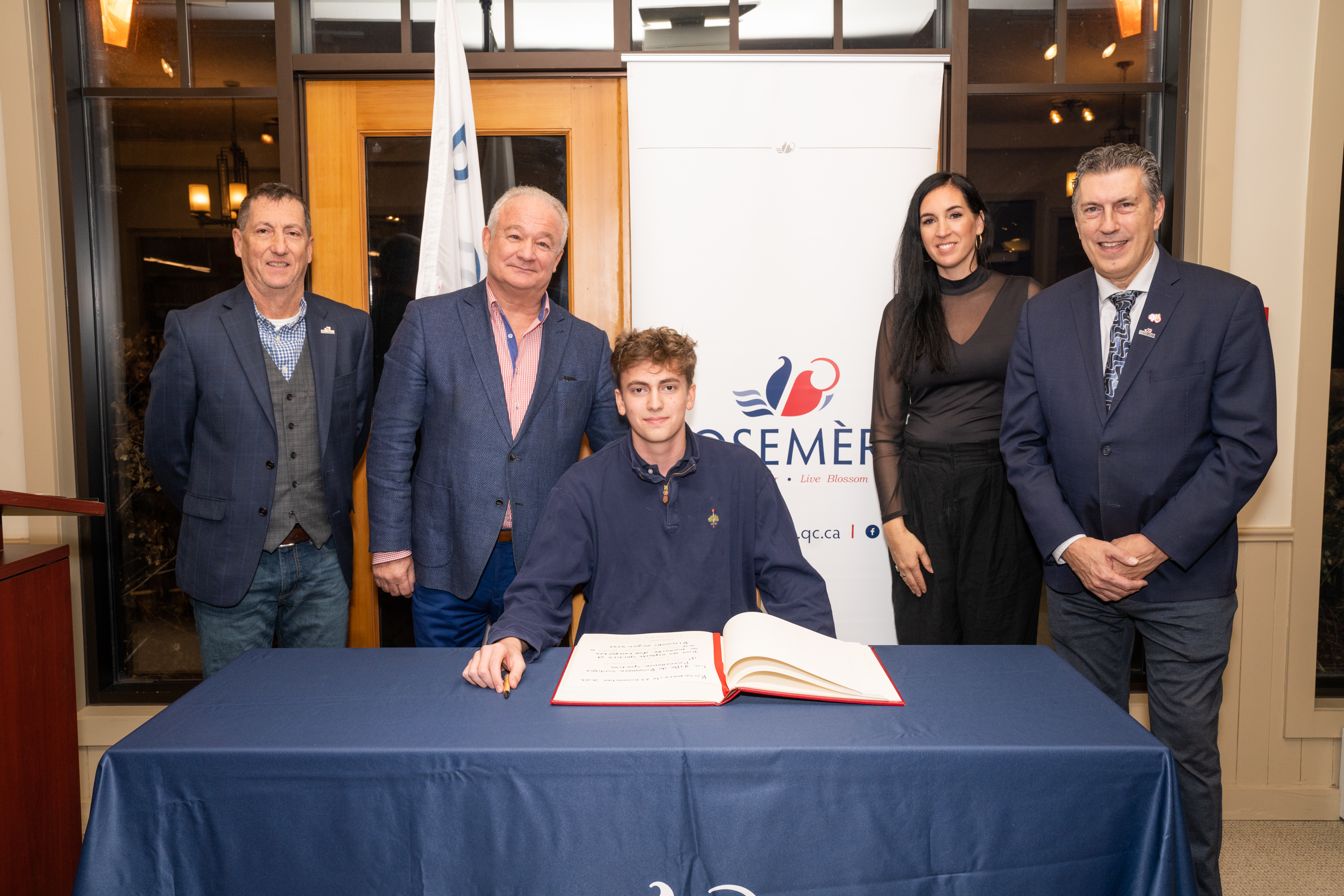 During a ceremony held in the atrium of H.J. Hemens Public Library on November 23, Rosemère mayor Eric Westram and councillors Stéphanie Nantel, Philip Panet-Raymond and René Villeneuve invited eight young Rosemerites to sign the Town’s Golden Book in recognition of their talent and perseverance. Family members and other supporters were also in attendance to pay tribute to these outstanding athletic and academic achievements.
