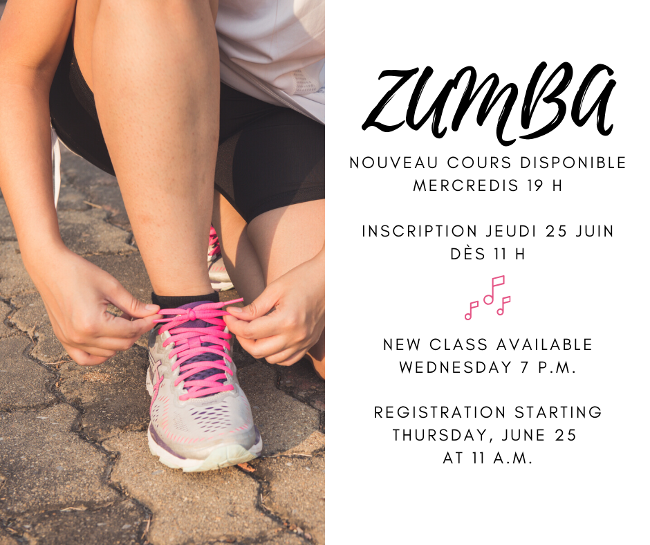 Dès le 25 juin 11 h, vous pourrez vous inscrire en ligne à un nouveau cours de zumba offert les mercredis à 19 h.