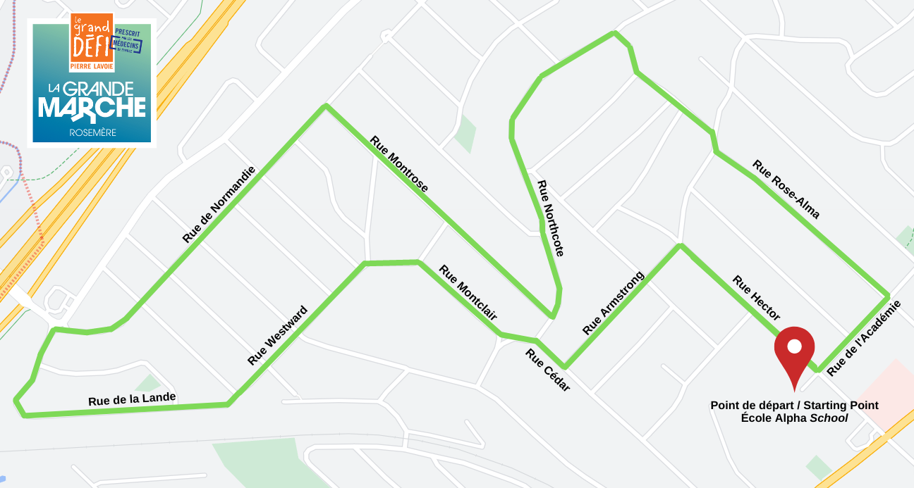 Départ à l'école Alpha (334, rue de l'Académie). Inscrivez-vous pour participer à la marche : https://onmarche.com