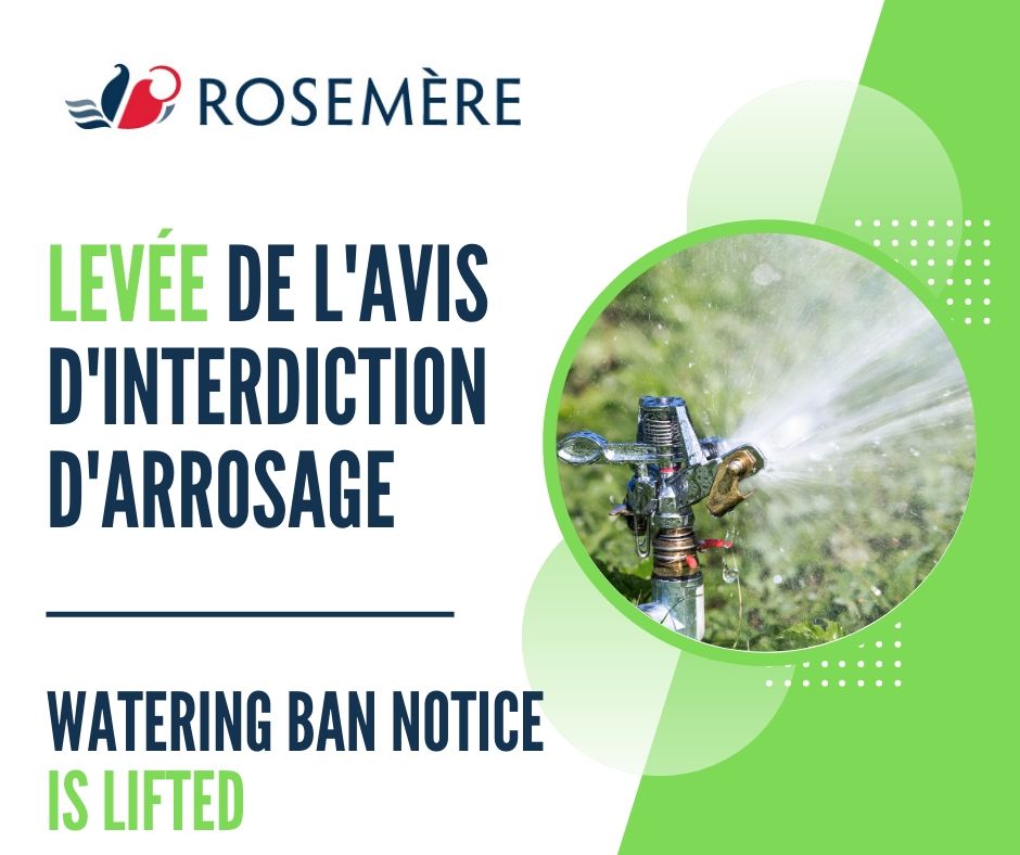 ROSEMÈRE, 7 juillet 2020 – La Ville de Rosemère lève l’avis d’interdiction d’arrosage émise depuis le 18 juin dernier. Elle demande toutefois aux citoyens de faire attention à leur consommation d’eau potable et de bien respecter la règlementation d’arrosage en vigueur.