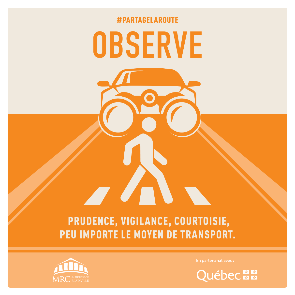 La MRC Thérèse-De Blainville, en collaboration avec les municipalités de Boisbriand, Blainville, Bois-Des-Filion, Lorraine, Rosemère, Sainte-Anne-Des-Plaines et Sainte-Thérèse ainsi que la Régie intermunicipale de police Thérèse-De Blainville, le Service de police de Terrebonne et le Service de police de Blainville, est heureuse de lancer sa nouvelle campagne de sensibilisation en sécurité routière #Partagelaroute. Cette campagne vise la protection des usagers vulnérables en matière de sécurité routière, en visant plus spécifiquement le partage de la route. Elle sera déployée en trois phases et selon trois thèmes : les piétons (OBSERVE), les motocyclistes (RALENTIS) et les cyclistes (PARTAGE). La première phase débute aujourd’hui, les phases deux et trois seront déployées en mai et juin prochain.