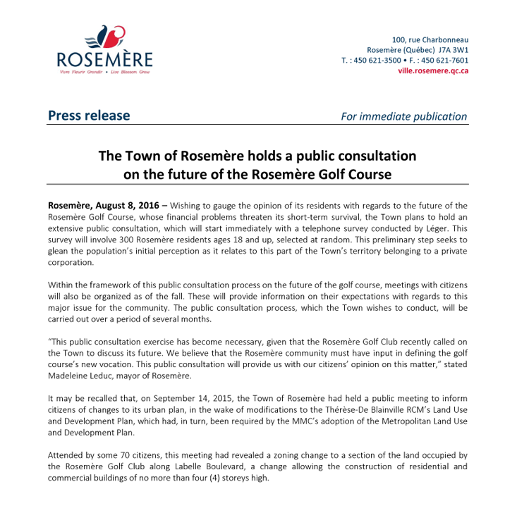 The Town of Rosemère holds a public consultation on the future of the Rosemère Golf Course