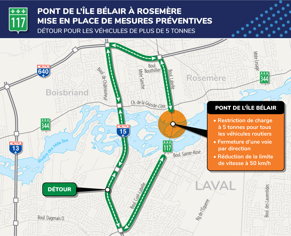 Le ministère des Transports informe les usagers de la route de la mise en place, le 1er novembre 2020, de mesures préventives sur le pont de l’île Bélair qui enjambe la rivière des Mille Îles, dans l’axe de la route 117 (boulevard Labelle), à Rosemère.