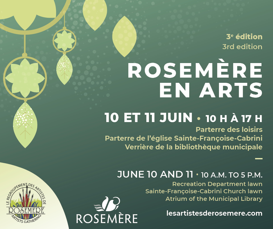 Rosemère en Arts se déroulera les 10 et 11 juin prochain, de 10 h à 17 h, sur les parterres du Service des loisirs et de l’église Sainte-Françoise-Cabrini ainsi qu'à la verrière de la bibliothèque municipale.