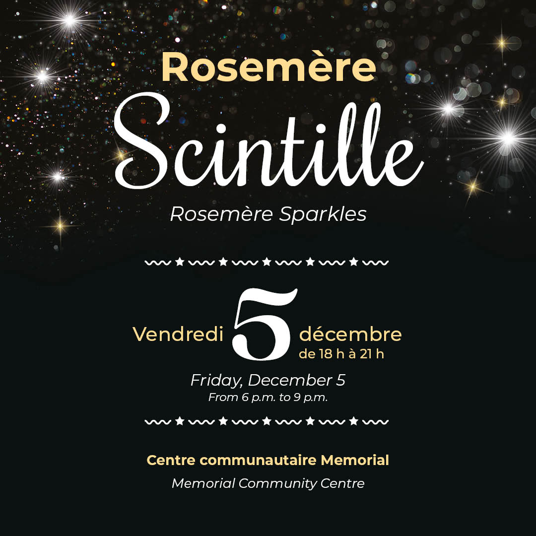To kick off the celebrations, we invite you on December 5, at 6 p.m. to Rosemère Sparkles, a festive and full of lights, revamped event, featuring Santa Claus (who will arrive at 6:30 p.m.), light shows, and a DJ. Public transportation should be preferred.