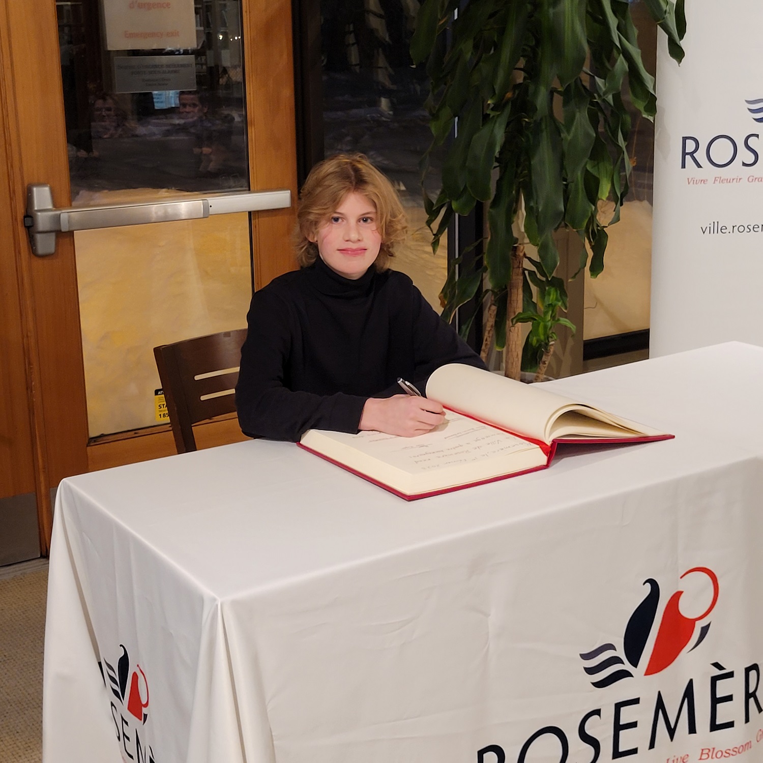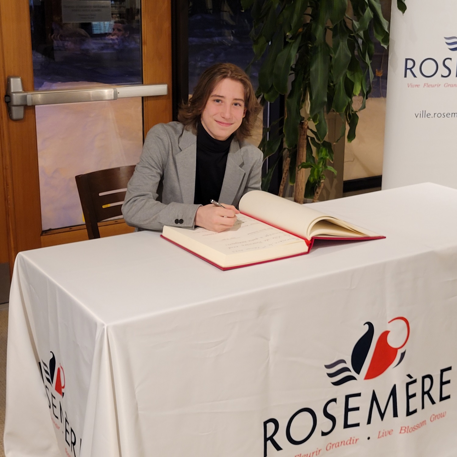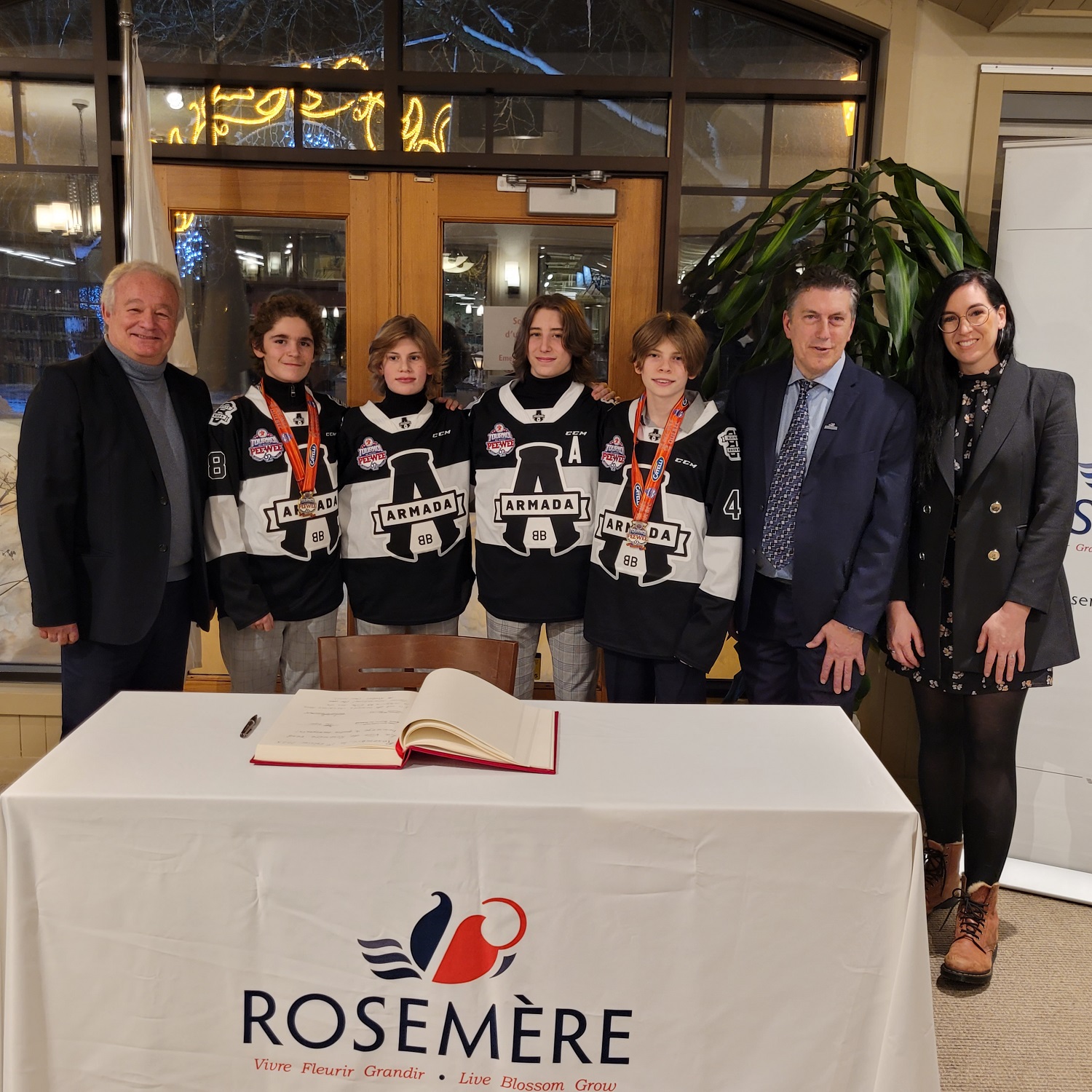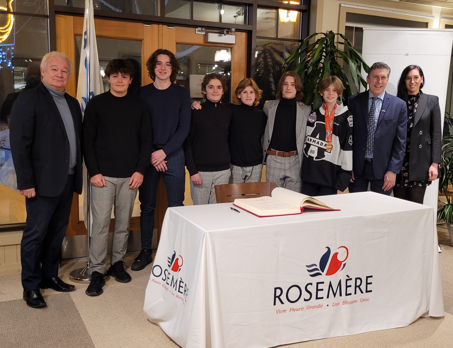 Le maire de Rosemère, Eric Westram, a débuté la séance de signatures par quatre hockeyeurs qui ont été nommés champions dans la catégorie AA Élite lors du Tournoi international pee-wee qui se déroulait à Québec en mai 2022. Il s’agit du défenseur Alexis Bonin-Lallemand, des attaquants Alex Auger et Thomas Harvey et du gardien Vincent V. Desautels. Ces quatre jeunes faisaient partie de l’équipe M13 AAA Élite des Seigneurs des Mille-Îles.