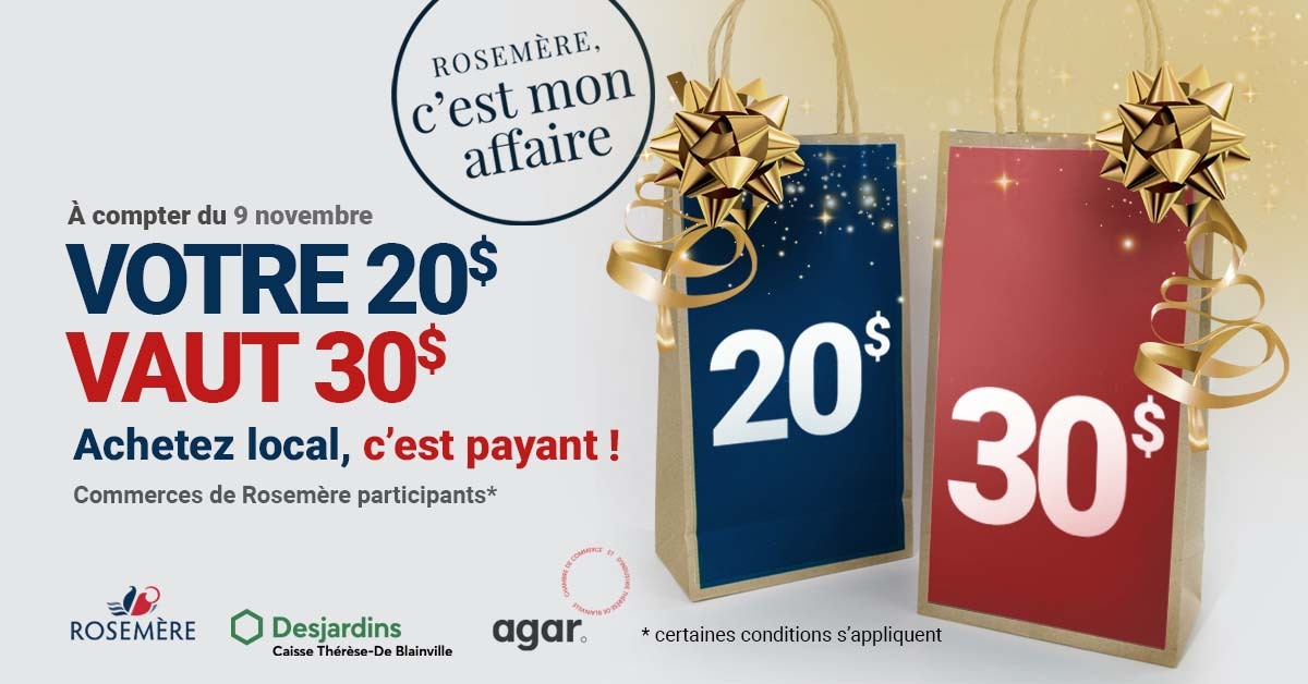 Grâce au soutien financier de la Ville de Rosemère, l’AGAR met en œuvre cette campagne de financement participatif qui permettrait d’injecter quelque 30 000 $ dans l’économie locale. Ainsi, les citoyens pourront se procurer des bons d’achat de 20 $ chez les commerces participants et la Ville bonifiera ces bons de 50% (10 $). Cette initiative contribuera à la relance économique et la pérennité des commerces. Pour connaître les commerces participants et acheter vos bons d’achat, rendez-vous au https://laruchequebec.com/rosemerecestmonaffaire.