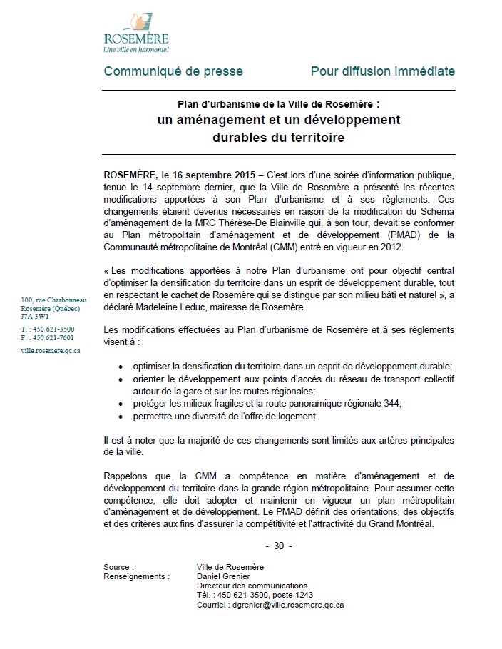 Urban Plan of the City of Rosemère: a sustainable development and development of the territory