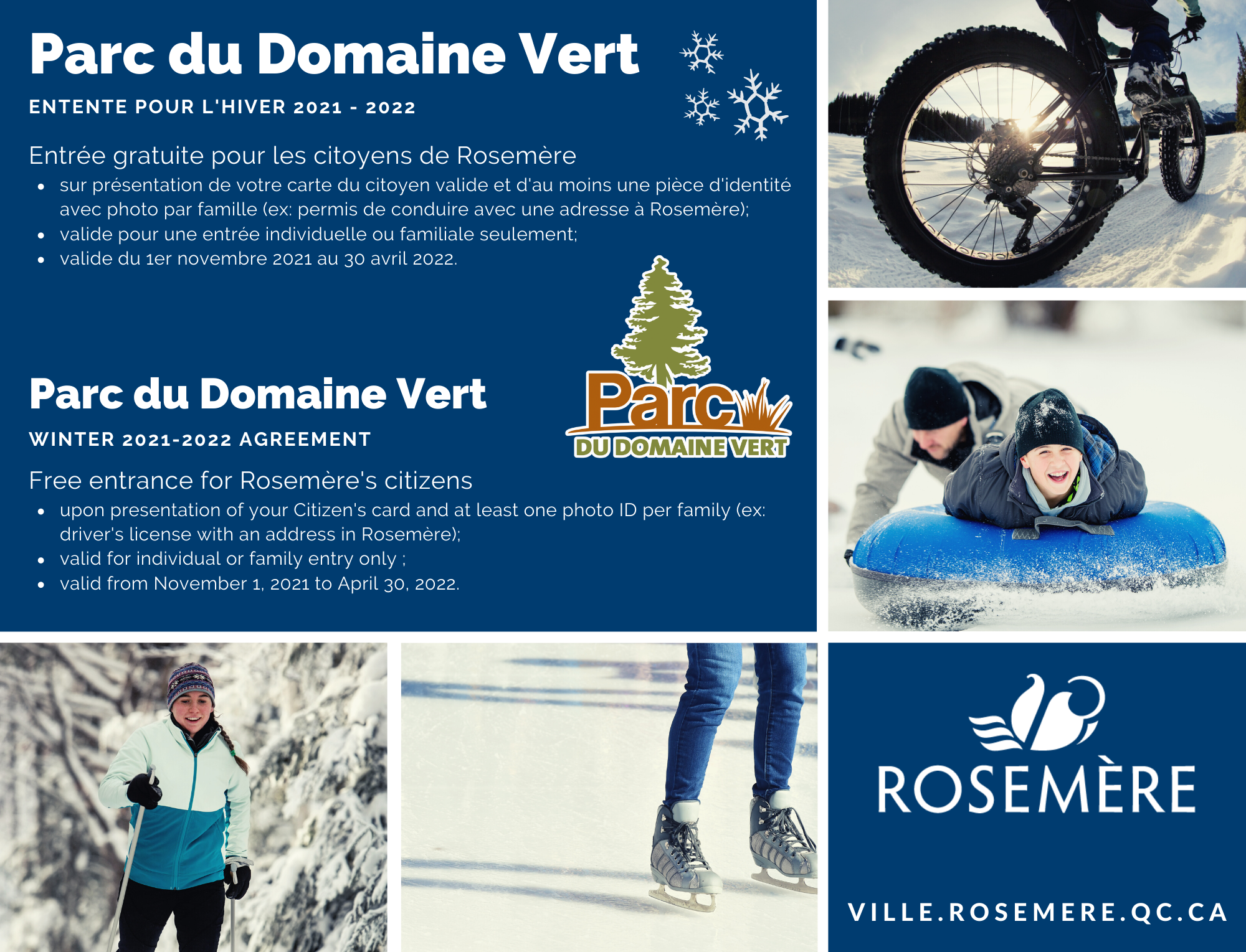 The Town of Rosemère is pleased to announce that it has entered into an agreement with Domaine Vert Park for the 2021-2022 winter season. A resolution on this matter was adopted at the Town Council meeting of October 4. With this agreement, Rosemerites will have free access to cross-country skiing, snowshoeing, walking and fat bike trails, with presentation of Citizen card. This agreement will take place from November 1st, 2021, to April 30, 2022.